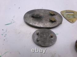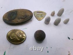 REAL CS BELT BUCKLES, CS SADDLE POMMEL PIECE, 3 MUSKET BALLS, 2 REVOLVER BALLS AND 1 GRAPE SHOP.