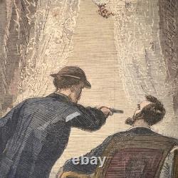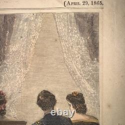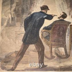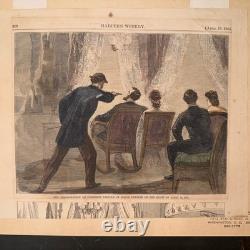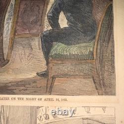 Title: The Assassination of President Lincoln at Ford's Theatre on the Night of April 14, 1865. Medium: Woodcut engraving with hand coloring. 11" x 16" (single leaf). Condition: Very good for age. Shows typical signs of age including a central crease (from original binding), light edge wear, and subtle foxing.
