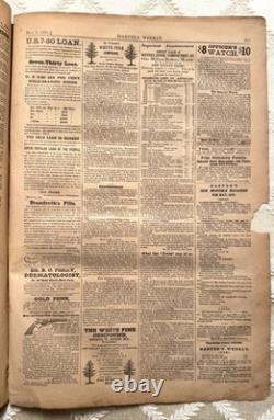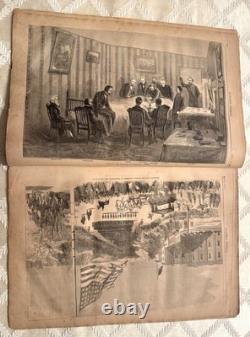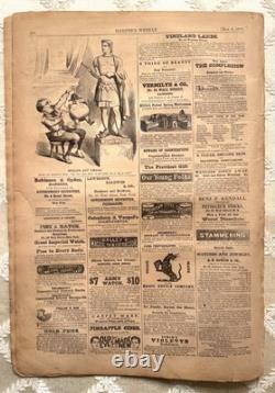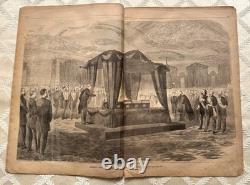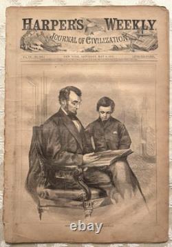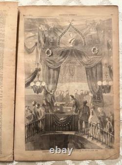ORIGINAL issue in amazing condition of Harper's Weekly from May 6, 1865, which features coverage of the funeral of President Lincoln. This historical newspaper item is from the United States and falls within the theme of militaria, specifically focusing on the Civil War period. As an original piece, it holds significant historical value and would be a prized addition to any collection related to this period in American history. There is foxing, minor wear and chipping on last page, and page 282 taped but no pictures affected.